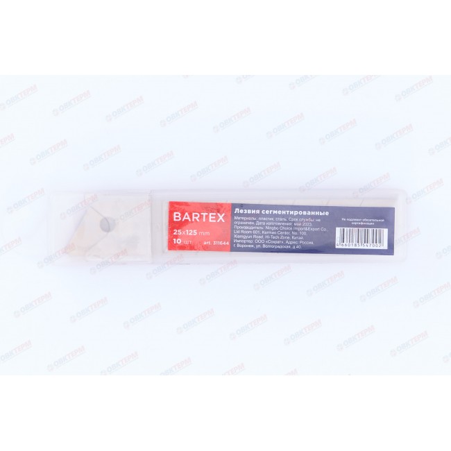 Лезвия Bartex являются запасными элементами для технического ножа. Изготовлены из инструментальной стали. Применяются для реза тонких неплотных материалов: линолеума, картона, бумаги, пластика, кожи, резины и т.д. Сегментированные трапециевидные лезвия имеют насечки, чтобы отломить затупившийся сегмент и продолжить работу новой режущей кромкой. Это помогает сэкономить время, не отвлекаясь на заточку ножа. Ширина лезвия составляет 25 мм, длина 125 мм.