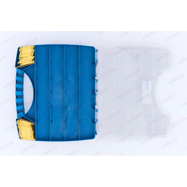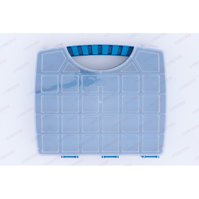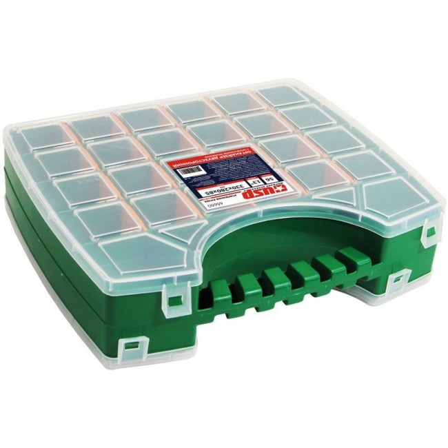 Органайзер предназначен для хранения и транспортировки различного крепежа, мелкого инструмента. Двухсторонний, снабжен 56-ю отсеками, которые просматриваются сквозь прозрачные крышки. Комплектуется съемными перегородками, с помощью которых можно изменять размер отсеков внутри органайзера. Изготовлен из пластика с усиленной ручкой. Размеры составляют 330*280*8,5 мм.