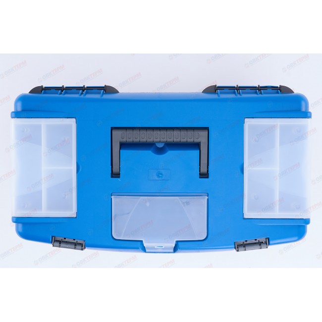 Предназначен для хранения и транспортировки различного инструмента. Ящик снабжен тремя органайзерами с прозрачными крышками, два из которых съемные. Комплектуется съемным лотком. Имеется возможность запирания на навесной замок. Изготовлен из пластика с морозостойкими замками. Ручка усиленная.