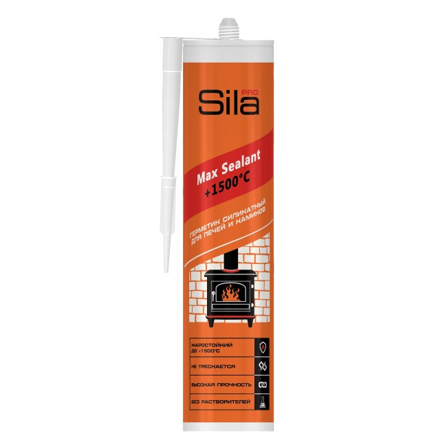 SILA PRO +1500°C - жаростойкий силикатный герметик, который выдерживает температуру до +1500 °C. Специализированный высококачественный однокомпонентный герметик на силикатной основе предназначен для герметизации, устойчивой к повышенным температурам и подходит для неподвижных соединений дымохода, камина, печи, печных труб, систем отопления, огнезащитных дверей, перегородок, дымоходов. Отверждается за счёт испарения воды. После полного высыхания, образует прочный огнеупорный жесткий шов, способный выдержать температуру до +1200 °С и кратковременно (до 30 минут) до +1500 °С. Используя огнеупорный герметик Sila PRO Max Sealant +1500°C, вы получите хорошую тягу в дымоходе, и надежную защиту помещения от проникновения дыма и угарного газа.