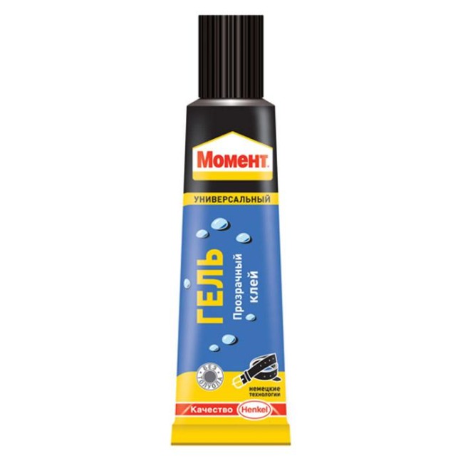 Момент Гель - универсальный контактный клей в виде геля, не растекается на вертикальных поверхностях и подходит для пористых поверхностей. Глеевая консистенция - идеален для вертикальных и впитывающих поверхностей. Прозрачный, водостойкий, не растекается, не капает, не оставляющий заметных следов. Предназначен для работы с пористыми и впитывающими материалами. В различных сочетаниях склеивает дерево, металл, резину, бумагу, картон, кожу, ткань, пробку, поролон, фарфор, керамику, стекло, кроме посуды, контактирующей с пищей.