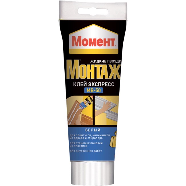 Клей Жидкие гвозди Момент Монтаж Экспресс МВ-50 является высококачественным универсальным клеем, разработанным специально для склеивания широкого спектра конструкций внутри помещения. На основе акриловой водной дисперсии. Без запаха. Первоначальная сила схватывания – 50 кг/м2. Склеивает большинство материалов таких как: стиропор, дерево, металл, ПВХ, керамика, ДСП, МДФ, гипсокартон, пробка, полистирол, пенопласт, гипс и другие подобные материалы. Так же используется для приклеивания: стеновых панелей из дерева, ПВХ, пробки, изоляционных панелей, декоративных деталей, профилей. Жидкие гвозди Момент влагостойкие и морозостойкие.