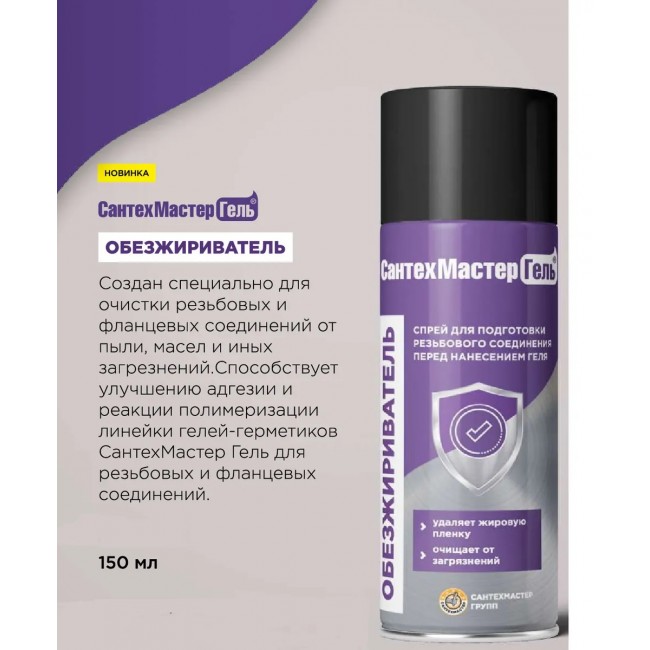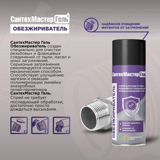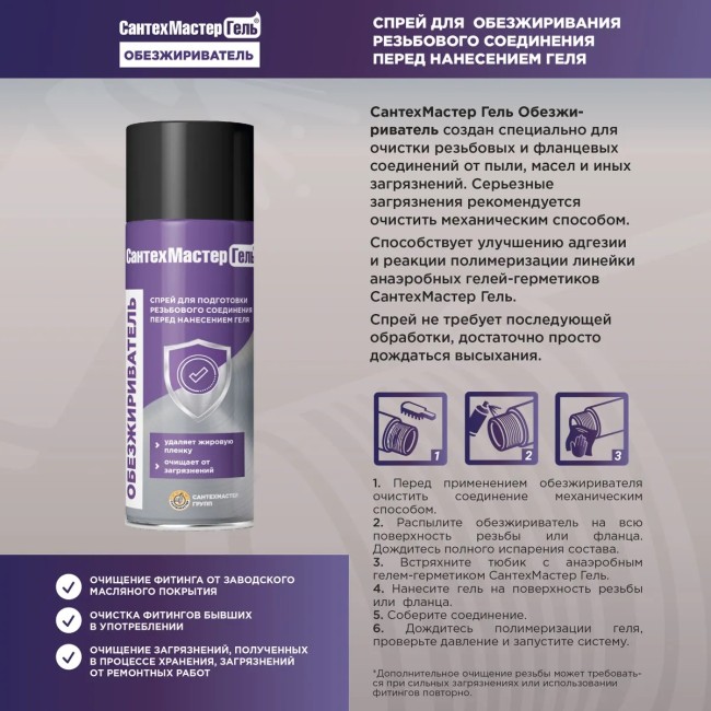 СантехМастер Гель Обезжириватель создан специально для очистки резьбовых и фланцевых соединений от пыли, масел и иных загрязнений. Серьезные загрязнения рекомендуется очистить механическим способом. Способствует улучшению адгезии и реакции полимеризации линейки анаэробных гелей-герметиков СантехМастер Гель. ПРЕИМУЩЕСТВА: Очищение фитинга от заводского масляного покрытия, загрязнений, полученных в процессе хранения, загрязнений от ремонтных работ. Очистка фитингов бывших в употреблении.