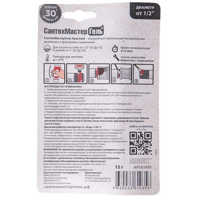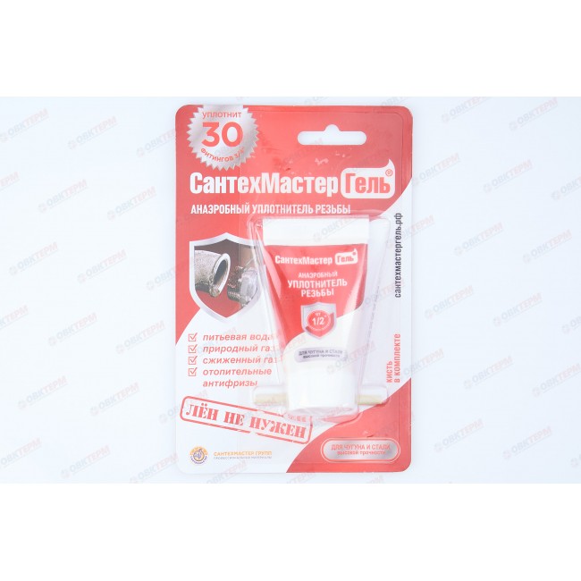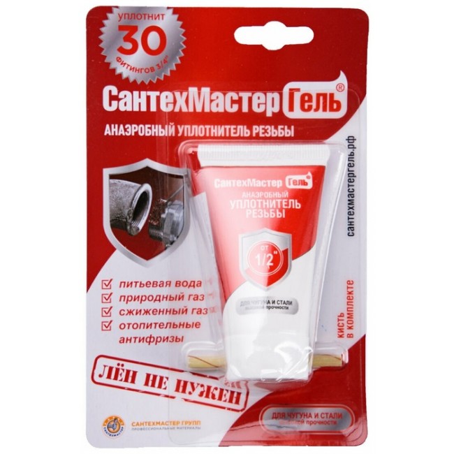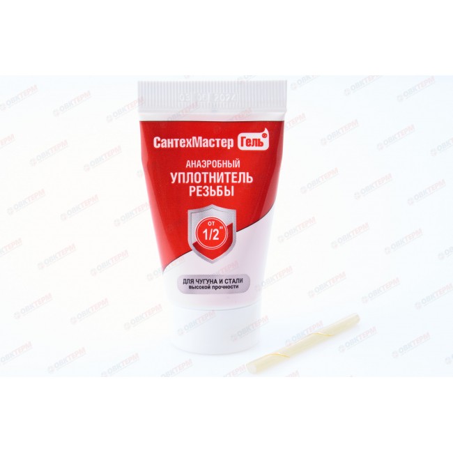 Сантехмастер Гель Красный для чугуна и стали 15 г — это анаэробный герметик для резьбовых соединений из черного металла. Этот гель отлично подходит для сверхпрочной фиксации и герметизации резьбы и фитингов в трубопроводах, собранных с использованием черных металлов. Применяется для соединений диаметром от 1,5.