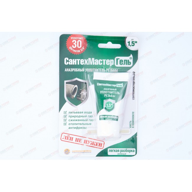 СантехМастер Гель Зеленый 15 г — это резьбовой герметик для металических соединений, созданный для легкого демонтажа соединений, которые располагаются в тяжело доступных местах, где невозможно использовать иные уплотнительные материалы. Он разработан для быстрой и качественной герметизации металлических фланцевых и резьбовых соединений. Данный гель-герметик разработан для труб диаметром до 1,5 дюймов. Соединение, собранное с использованием СантехМастер Гель Зелёный поддается легкому демонтажу без применения нагрева.