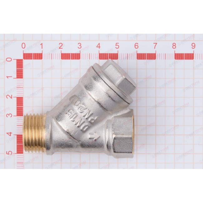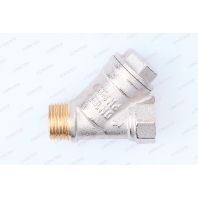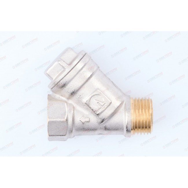 Фильтр механической очистки косого типа. Может устанавливаться в горизонтальном и вертикальном (движение потока – сверху–вниз) положении. Корпус и пробка изготовлены горячим прессованием из латуни марки CW617N (европейский стандарт EN 12165) и никелированы. Между ними предусмотрена тефлоновая уплотнительная прокладка. Пробка оснащена отверстием для пломбировки. Размер ячеек сетки фильтрующего элемента – 500 мкм, максимальное рабочее давление – 20 бар. Максимальная рабочая температура фильтруемой среды – 150 °C. Условный диаметр – 1/2". Резьба присоединения – внутренняя/наружная.