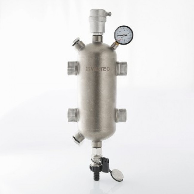 Гидравлический распределитель (гидравлическая стрелка) VT.VAR05.SS изготовлен из нержавеющей стали марки AISI 304. Это обеспечивает меньшую стоимость аппарата, по сравнению с бронзовым, при высокой коррозионной стойкости и прочности. Конструкторы VALTEC дополнили гидрострелку спиральным сепаратором, интенсифицирующим отделение воздуха из теплоносителя, а также разделительной перегородкой, снижающей теплопотери из-за конвекции рабочей среды. Оба элемента выполнены перфорированными, из нержавеющей стали.