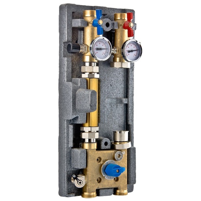 Модули быстрого монтажа VARIMIX – продуманные конструкторами, компактно собранные и теплоизолированные в заводских условиях арматурные узлы. Их применение позволяет до минимума сократить время проектирования и монтажа системы теплоснабжения коттеджа, таунхауса, небольшого коммерческого объекта и т.д., избежать проектных и монтажных ошибок. При этом стоимость готового модуля ниже стоимости аналогичного по составу набора элементов, приобретаемых по отдельности. Насосный модуль VAR 20 предназначен для присоединения к коллекторному модулю VAR 30 контуров с температурой, пониженной по отношению к котловому контуру. Заданная температура теплоносителя в контуре поддерживается с помощью входящих в состав узла байпаса с балансировочным клапаном и трехходового смесительного клапана. Для защиты циркуляционного насоса от работы «на закрытую задвижку», а также для сохранения гидравлической устойчивости системы в целом в модуле предусмотрен байпас с регулируемым перепускным клапаном.