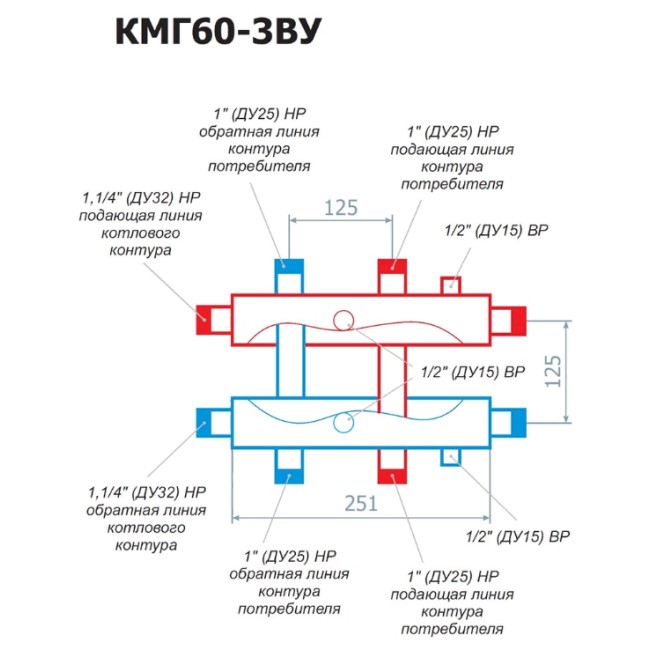 Макс. мощность, кВт — 60; Макс. давление, бар — 6; Макс. tоС теплоносителя, оС — 110; Количество патрубков потребителей, шт — 3; Диаметр котловой, дюйм — 1¼ НР (Ду-32); Диаметры потребителей, дюйм — 1 НР (Ду-25); Размер под воздухоотводчик, промыв. кран, дюйм — ½ ВР (Ду-15); Размер подключения термометров, дюйм — ½ ВР (Ду-15); Подключение котла — слева/справа; Расположение — горизонтальное; Межосевое расстояние котловых выходов, мм — 125; Межосевое расстояние выходов потребителей (включая боковой), мм — 125; Габариты (без учёта патрубков), ШхВхГ (мм) — 251х185х60; Вес (сталь), кг — 3.7; Толщина стенок, мм — 3 мм; Покрытие — полимеро-порошковое напыление; Крепление, шт — 2 кронштейна (приваренные "ушки").