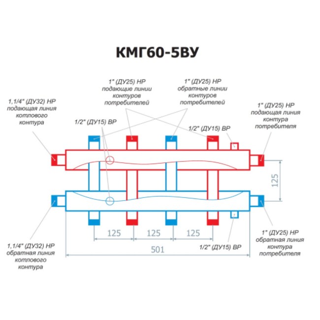 Макс. мощность, кВт — 60; Макс. давление, бар — 6; Макс. tоС теплоносителя, оС — 110; Количество патрубков потребителей, шт — 5; Диаметр котловой, дюйм — 1¼ НР (Ду-32); Диаметры потребителей, дюйм — 1 НР (Ду-25); Размер под воздухоотводчик, промыв. кран, дюйм — ½ ВР (Ду-15); Размер подключения термометров, дюйм — ½ ВР (Ду-15); Подключение котла — слева/справа; Расположение — горизонтальное; Межосевое расстояние котловых выходов, мм — 125; Межосевое расстояние выходов потребителей (включая боковой), мм — 125; Габариты (без учёта патрубков), ШхВхГ (мм) — 501х185х60; Вес (сталь), кг — 7.06; Толщина стенок, мм — 3 мм; Покрытие — полимеро-порошковое напыление; Крепление, шт — 2 кронштейна (приваренные "ушки").