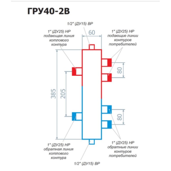 Макс. мощность, кВт — 40; Макс. давление, бар — 6; Макс. tоС теплоносителя, оС — 110; Количество контуров потребителей, шт — 2; Диаметры котловые, дюйм — 1 НР (Ду-25); Диаметры потребителей, дюйм — 1 НР (Ду-25); Размер под воздухоотводчик, промыв. кран, дюйм — ½ ВР (Ду-15); Подключение котла — слева/справа; Расположение — вертикальное; Межосевое расстояние выходов потребителей, мм — 80; Межосевое расстояние котловых выходов, мм — 205; Габариты (без учёта патрубков), ШхВхГ (мм) — 60х385х60; Вес (сталь), кг — 2.4; Толщина стенок, мм — 3 мм; Покрытие — полимеро-порошковое напыление; Крепление, шт — 2 кронштейна (приваренные "ушки").