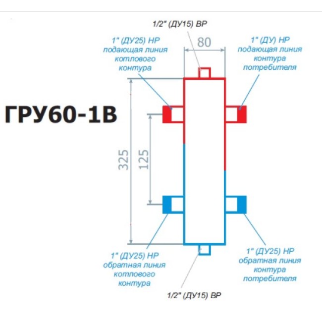Макс. мощность, кВт — 60; Макс. давление, бар — 6; Макс. tоС теплоносителя, оС — 110; Количество контуров потребителей, шт — 1; Диаметры котловые, дюйм — 1 НР (Ду-25); Диаметры потребителей, дюйм — 1 НР (Ду-25); Размер под воздухоотводчик, промыв. кран, дюйм — ½ ВР (Ду-15); Подключение котла — слева/справа; Расположение — вертикальное; Межосевое расстояние выходов потребителей, мм — 125; Межосевое расстояние котловых выходов, мм — 125; Габариты (без учёта патрубков), ШхВхГ (мм) — 80х325х80; Вес (сталь), кг — 2.8; Толщина стенок, мм — 3 мм; Покрытие — полимеро-порошковое напыление; Крепление, шт — 2 кронштейна (приваренные "ушки").
