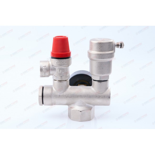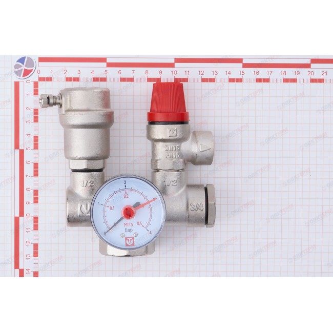 Комплектная группа безопасности для оснащения котлов и бойлеров систем автономного отопления, ГВС. Применяется в установках с тепловой мощностью до 44 кВт (определяется штатным предохранительным клапаном), номинальным давлением не выше 10 бар, рабочей температурой не более 120 °С. Допустимая рабочая среда – пар, вода, незамерзающий теплоноситель (максимальное содержание гликолей – 50 %). Состав изделия: предохранительный клапан (настройка – фиксированная, 3 бара), автоматический воздухоотводчик, манометр, латунный никелированный корпус. Предусмотрен резьбовой патрубок для подключения расширительного бака (диаметр – 3/4”). Группа безопасности котла монтируется на выходе теплогенератора. Резьба присоединения – внутренняя, 1”.