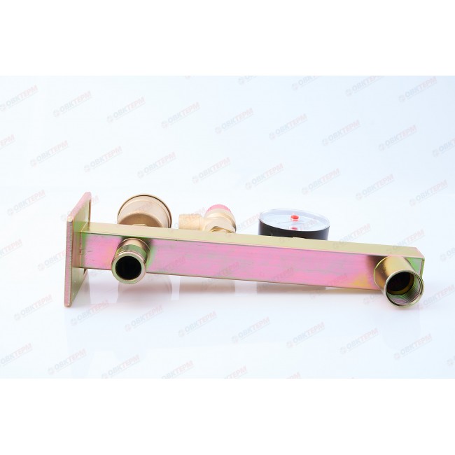 В сущности, этот простой элемент состоит из трех разных приборов, установленных на общем коллекторе. Последний изготавливается из латуни или нержавеющей стали и имеет 3 посадочных места в виде отверстий с резьбой.