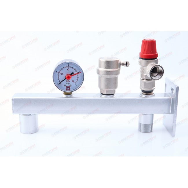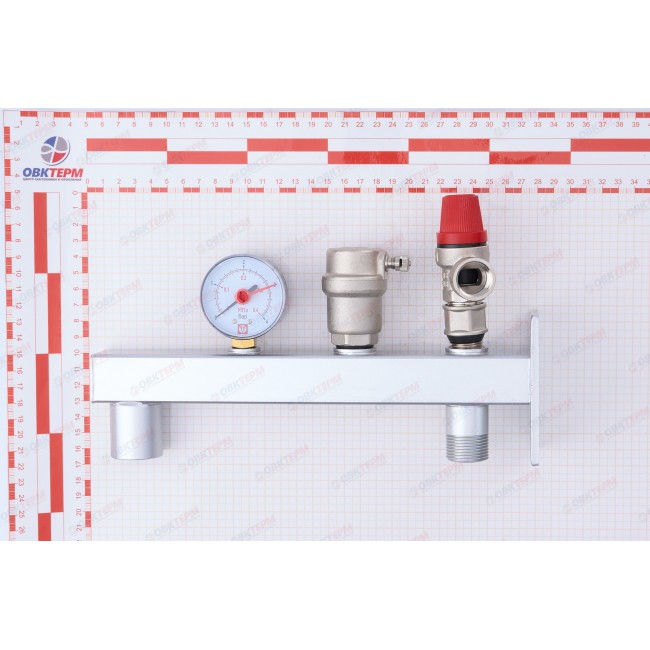 Группа безопасности стальная консольная (группа безопасности расширительного бака) представляет собой смонтированные на полой консоли из оцинкованной стали предохранительный клапан с фиксированной настойкой, автоматический воздухоотводчик, манометр. Консоль оборудована резьбовыми патрубками – присоединительным и для мембранного бака, фланцем настенного крепления. Непосредственно к группе допускается подвешивать «мембранник» объемом до 50 л. Оборудование рассчитано на применение в системах тепловой мощности до 44 кВт (увеличивается заменой предохранительного клапана); номинальное давлением – 10 бар; максимальная температура рабочей среды (вода, пар, незамерзающий теплоноситель с концентрацией гликоля не выше 50 %) – 120 °C. Функциями изделия являются защита системы отопления/ГВС от превышения давления, завоздушивания, индикация текущего значения давления, крепление мембранного бака.