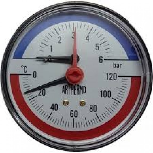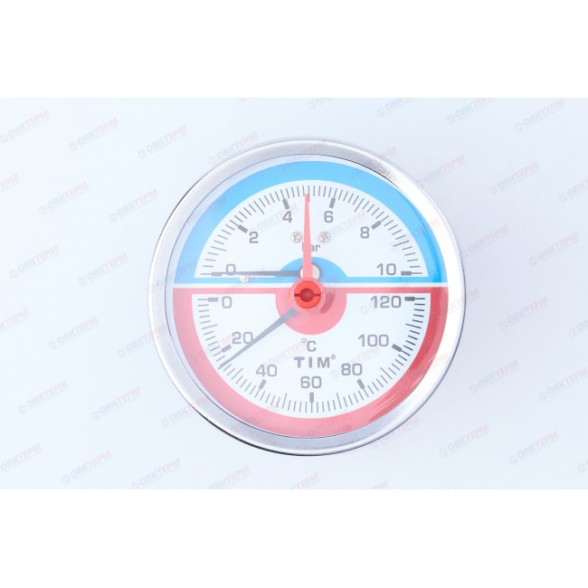 Термо-манометр аксиального подключения, (сзади корпуса), диапозон измерения до 10 бар, корпус: металлический + стекло, от 0 до 120 градусов.