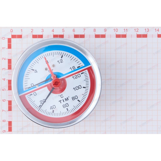 Термо-манометр аксиального подключения, (сзади корпуса), диапозон измерения до 16 бар, корпус: металлический + стекло, от 0 до 120 градусов.