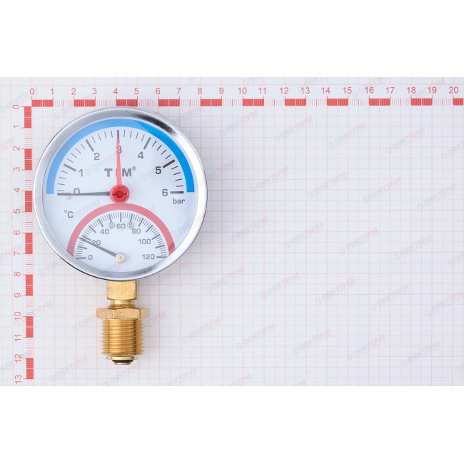 Термо-манометр с нижним подключением, диапозон измерения до 6 бар. корпус: металлический + стекло. от 0 до 120 градусов.