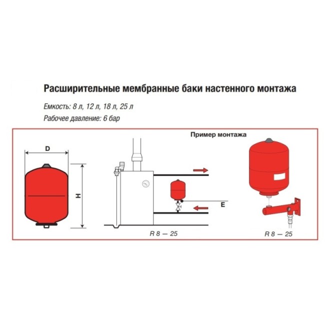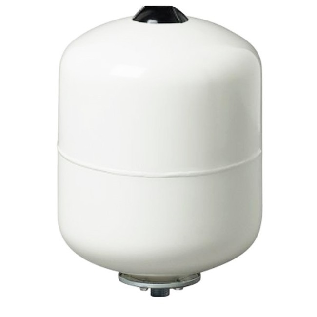 Расширительный бак — элемент системы отопления, предназначенный для приёма избытка воды, возникающего при её тепловом расширении в результате нагревания. Внутреннее пространство всех элементов системы отопления (трубопроводов, отопительных приборов, арматуры, оборудования и т. д.) заполнено водой. Получающийся при заполнении объём воды в процессе эксплуатации системы претерпевает изменения: при повышении температуры воды он увеличивается, при понижении — уменьшается. Соответственно изменяется внутреннее давление. Однако эти изменения не должны отражаться на работоспособности системы отопления и, прежде всего, не должны приводить к превышению предела прочности любых её элементов. Поэтому в систему водяного отопления вводится дополнительный элемент — расширительный бак. Мембранный расширительный бак для систем отопления, ГВС и гелиосистем. Рабочая температура теплоносителя : - 10 *С ; - 99 *С. Присоединительный размер : 3/4" (HP). Материал мембраны : EPDM. P раб.max : 8 бар. Обьем 24 литров
