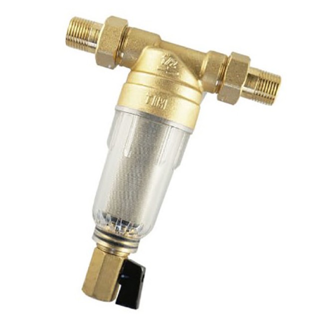 Фильтр промывной 1/2" без манометра, прозрачный корпус, комплектован: мини-кран 3/8", комплект фитингов с наружной резьбой 1/2". Имеется также отверстие для опломбировки.Рабочая температура 0-40 С, До 16 бар, размер фильтрующей ячейки 100 мк