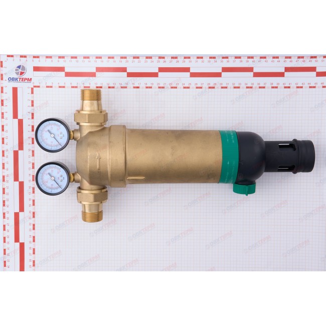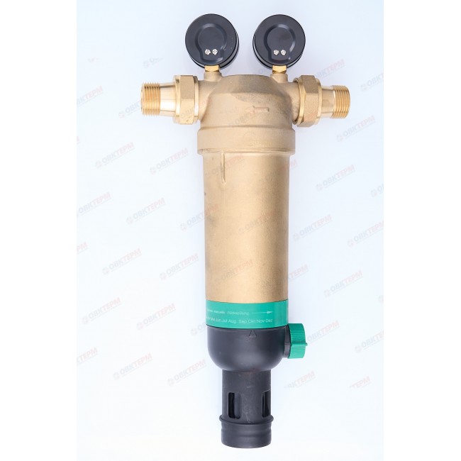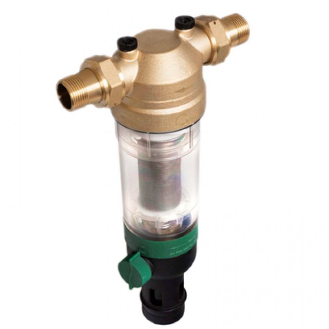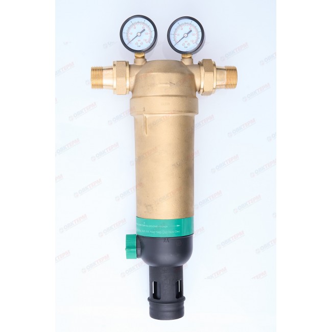 Фильтр механической очисткои с обратной промывкой Верхняя часть устройства: латуни Корпуса фильтрующего элемента: прозрачный пластик Армированная волокном мембрана NBR вариант присоединения: американки 1" наружной - 1" наружной Имеется отверстие для опломбировки. Рабочая температура 0-80 С, До 25 бар, размер фильтрующей ячейки 100 мк