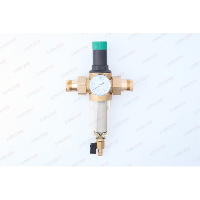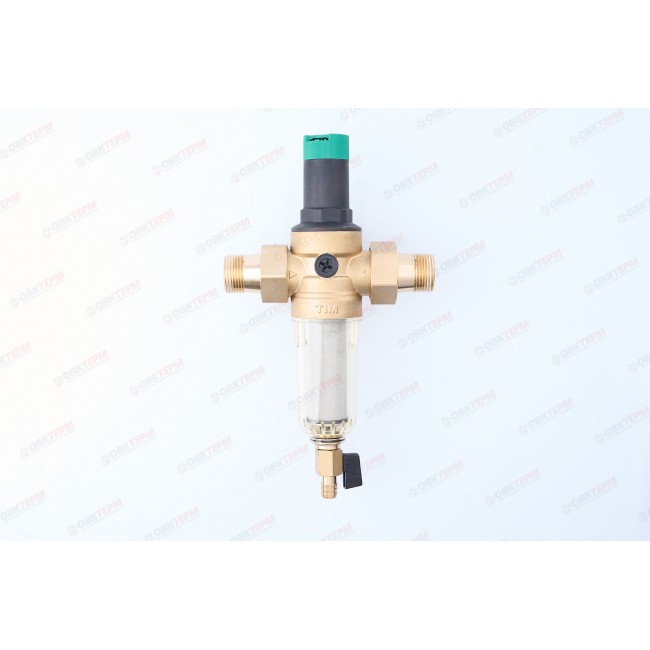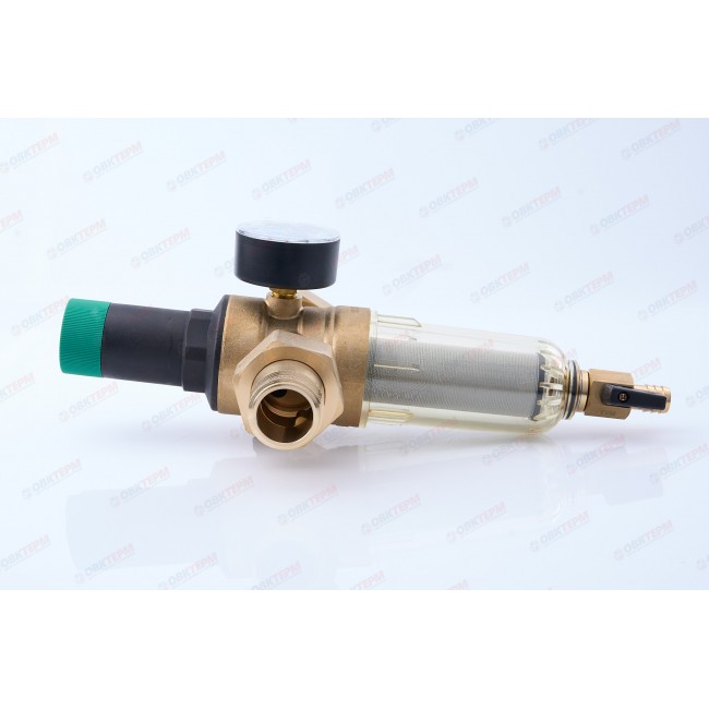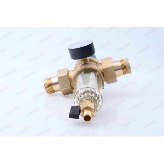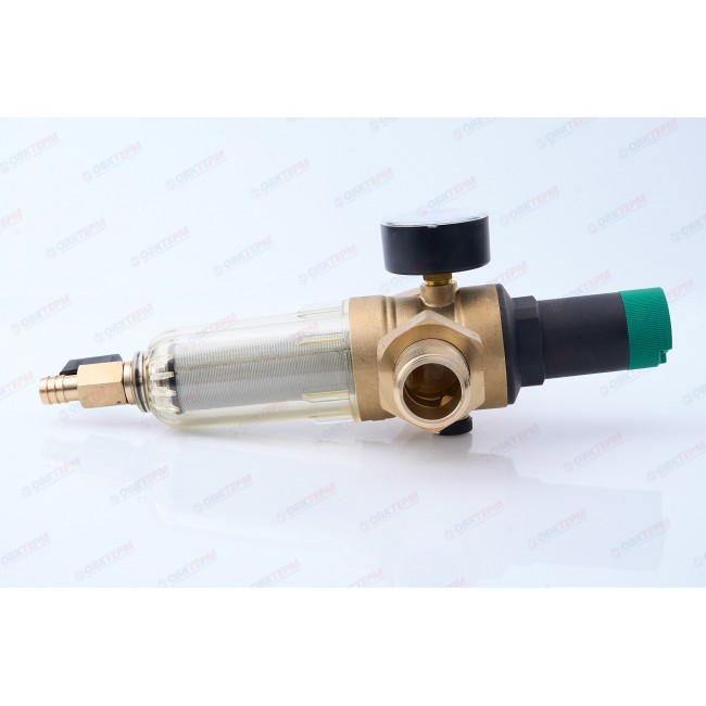 Фильтр промывной с редуктором снижения давления, прозрачный корпус , комплектован: мини-кран 3/8", комплект фитингов с наружной резьбой 1", манометр аксиальный, Имеется также отверстие для опломбировки.Регулировка давления от 1,5 бар до 6,0 бар. Максимальное входное давление - 16 бар. Максимальная температура - 40 С. Размер фильтрующей ячейки - 100 мк