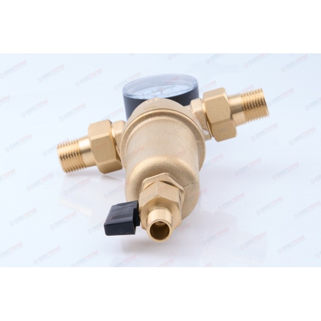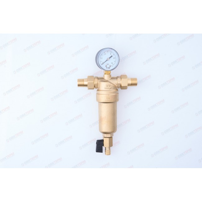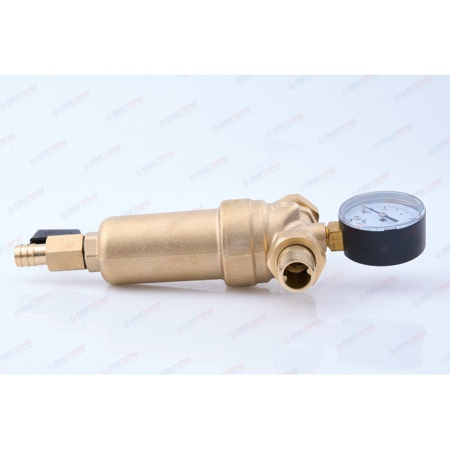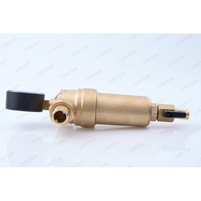 Фильтр промывной 1/2" с манометром, латунный корпус, комплектован: мини-кран 3/8", манометр радиальный, комплект фитингов с наружной резьбой 1/2". Имеется также отверстие для опломбировки.Рабочая температура 0-80 С, До 25 бар, размер фильтрующей ячейки 100 мк