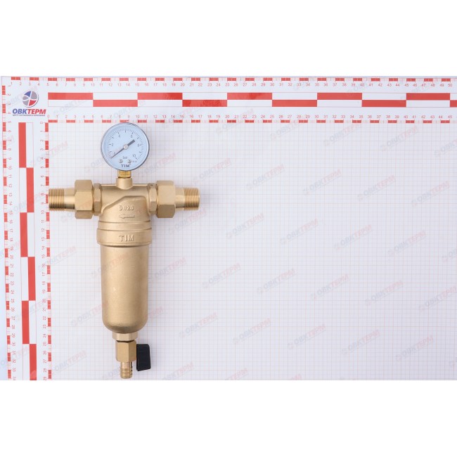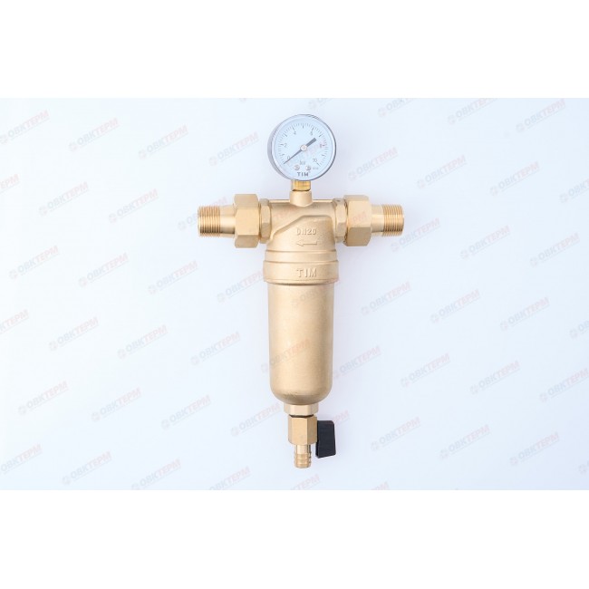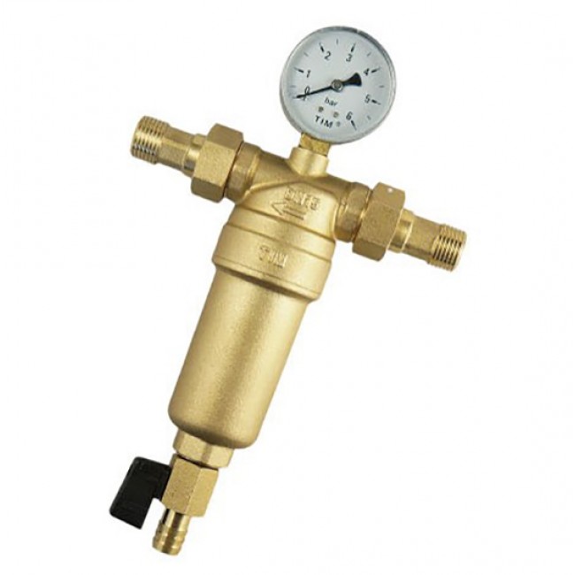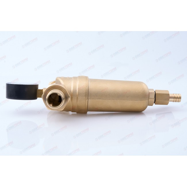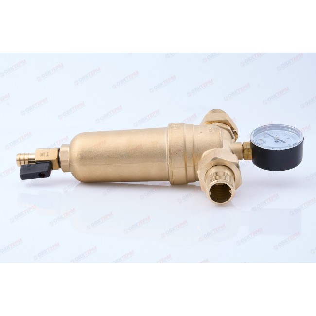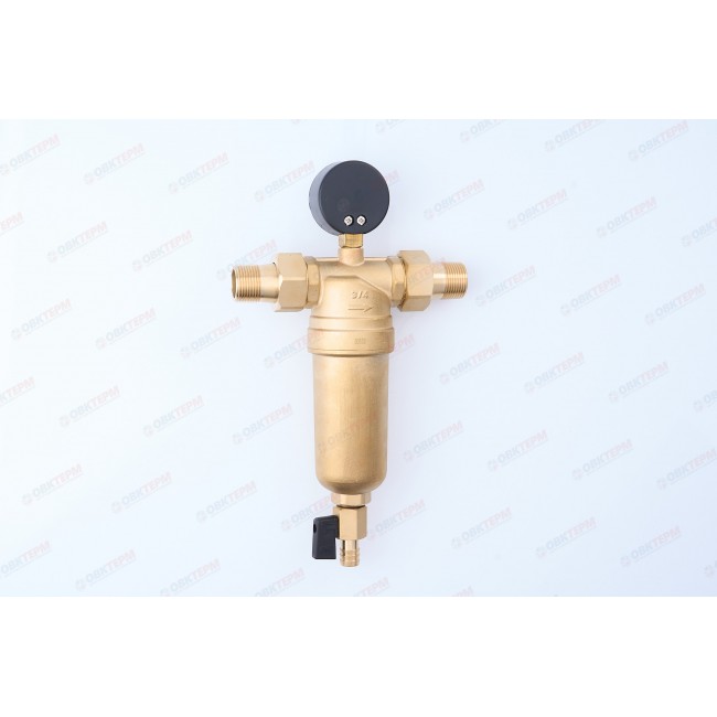 Фильтр промывной 3/4" с манометром, латунный корпус, комплектован: мини-кран 3/8", манометр радиальный, комплект фитингов с наружной резьбой 3/4". Имеется также отверстие для опломбировки.Рабочая температура 0-80 С, До 25 бар, размер фильтрующей ячейки 100 мк