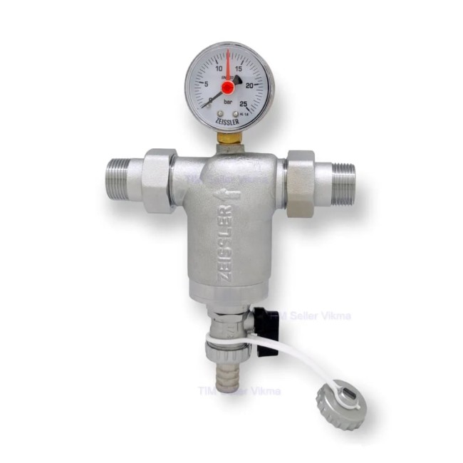 Фильтр промывной 1/2" с манометром, латунный никелированный корпус, комплектован: мини-кран 3/8", манометр радиальный, комплект фитингов с наружной резьбой 1/2".Максимальное давление - 25 бар, Максимальная температура - 95 С, Размер ячеек картриджа - 100 мк