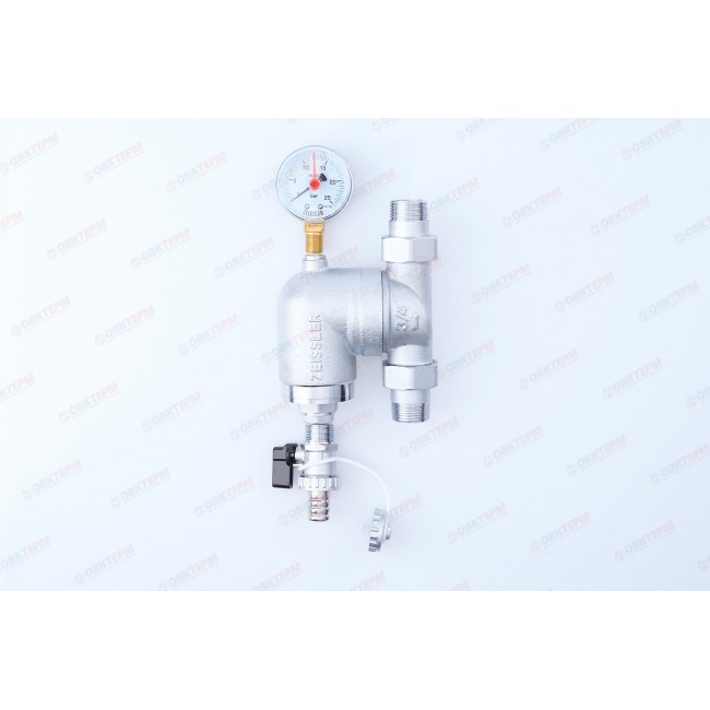 Фильтр промывной 3/4" с манометром, с фланцом для свободного вращения, возможно установить и горизотально и вертикарильно, латунный никелированный корпус, комплектован: мини-кран 3/8", манометр радиальный, комплект фитингов с наружной резьбой 3/4". Рабочая температура 0-95 С, До 25 бар, размер фильтрующей ячейки 100 мк .