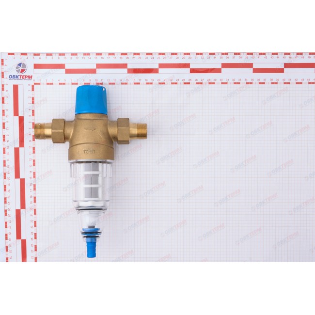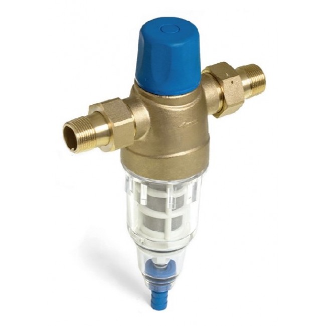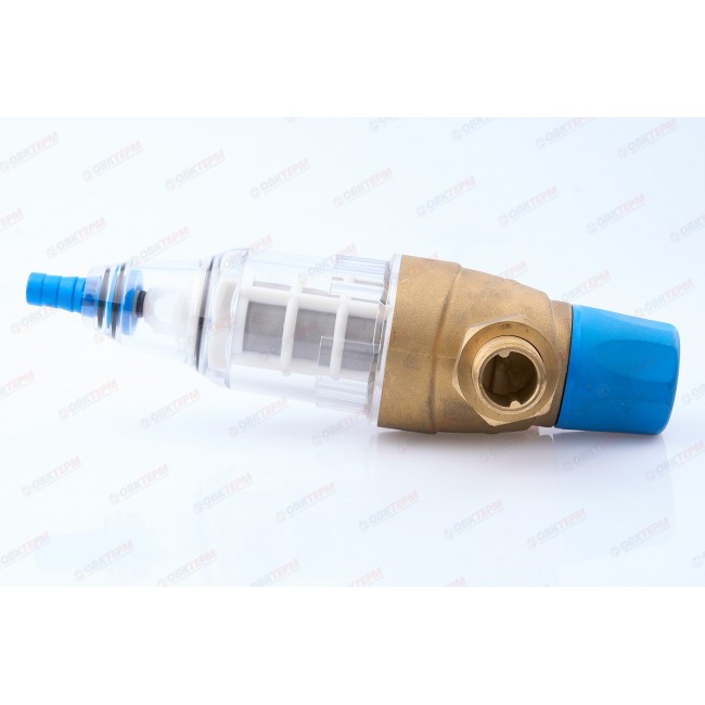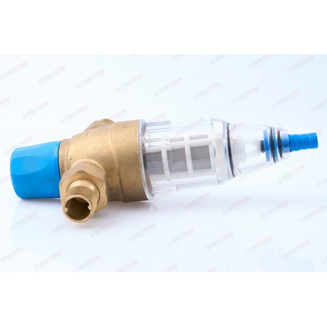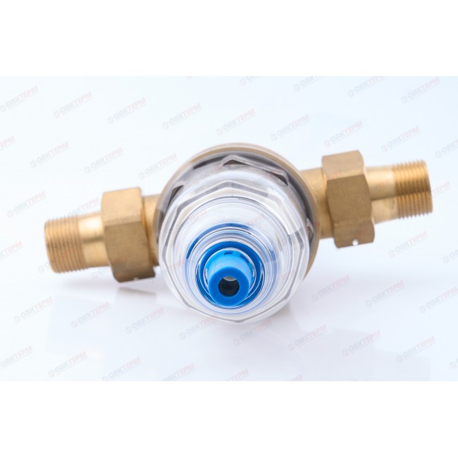 Фильтр механической очисткои с ручной обратной промывкой Верхняя часть устройства: латуни Корпуса фильтрующего элемента: прозрачный пластик вариант присоединения: американки 3/4" наружной - 3/4" наружной Имеется отверстие для опломбировки.Рабочая температура 0-40 С, До 16 бар, размер фильтрующей ячейки 100 мк .