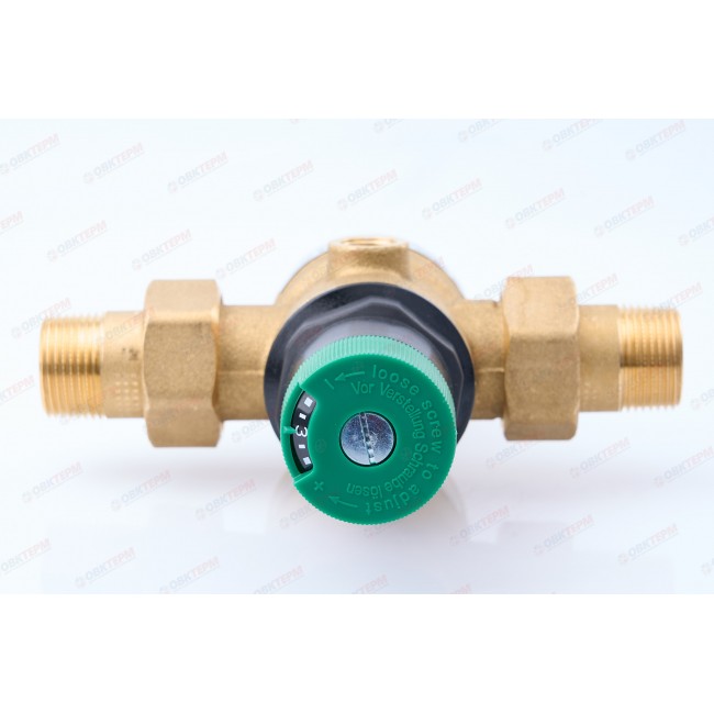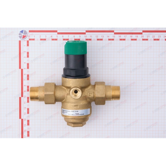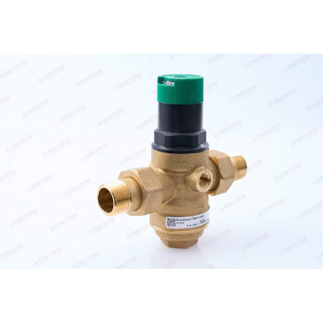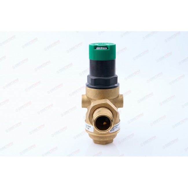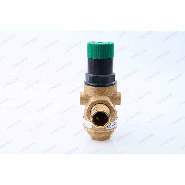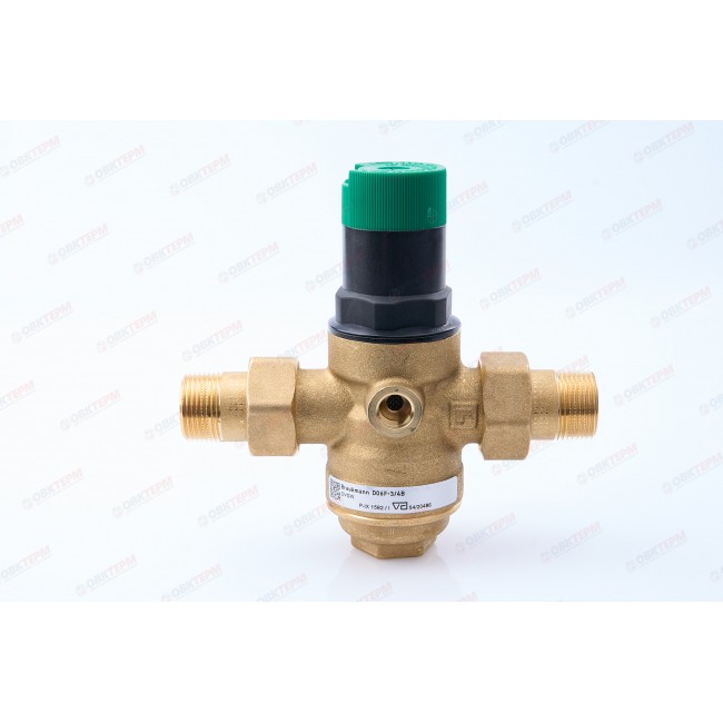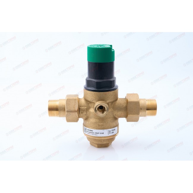 Редукционный клапан с понижением давления D06F-3/4" А для холодной воды предохраняет бытовые установки водоснабжения от избыточного давления в системе. Редукционный клапан Honeywell D06F состоит из: - корпуса с внешней резьбой и резьбовыми отверстиями для манометра (оба на выходе) (манометр в комплект не входит); - присоединительных штуцеров с наружной резьбой; - вкладыша клапана с диафрагмой и седлом клапана; - фильтра с сеткой 160 мкм; - чаши фильтра из ударопрочного пластика; - регулировочной пружины; - пружинного стакана с регулировочной ручкой и установочной шкалой.
