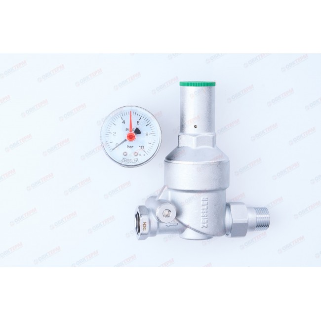 Стабилизирует, а также уменьшает давление в водопроводной сети, защищая тем самым от высокого давления трубопровод и подключённое к нему бытовое оборудование. Его конструкция позволяет легко извлечь картридж регулировки давления. Особенность данной модели заключается в том, что регулятор является мембранным, а не поршневым. Благодаря данной конструкции, выходное давление можно настроить с максимальной точностью.