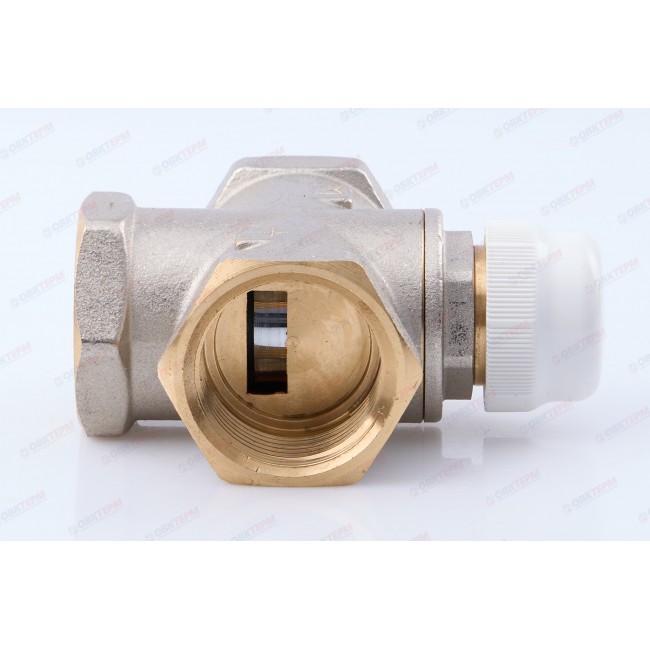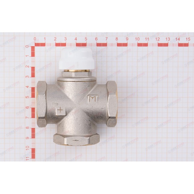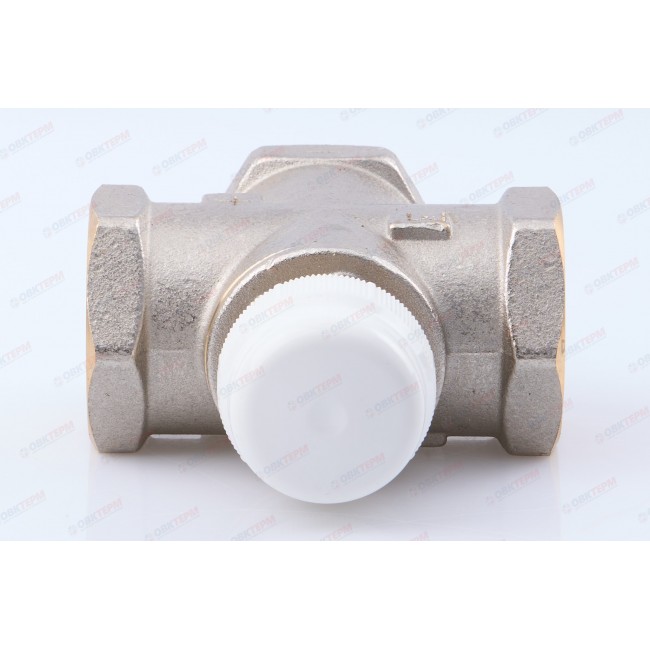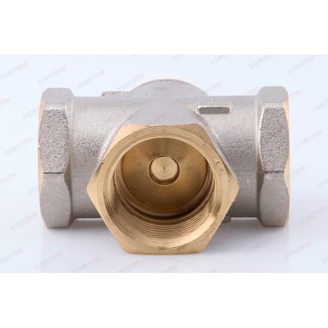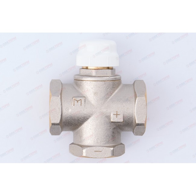 Клапан предназначен для использования в смесительных узлах гидравлических систем (байпасные узлы подмеса, узлы смешения для получения заданного уровня температуры смешанной жидкости и т.п.). Регулирование клапаном может осуществляться вручную или с помощью сервопривода. Корпус выполнен из латуни марки CW617N (европейский стандарт EN 12165), никелирован. Материал штока, основания золотника и пружины – нержавеющая сталь марки AISI 316, золотникового уплотнителя – синтетический каучук EPDM. Резьба присоединительных патрубков – внутренняя, 1". Данная модель – c боковым смешением и допускает полное перекрытие входных патрубков.