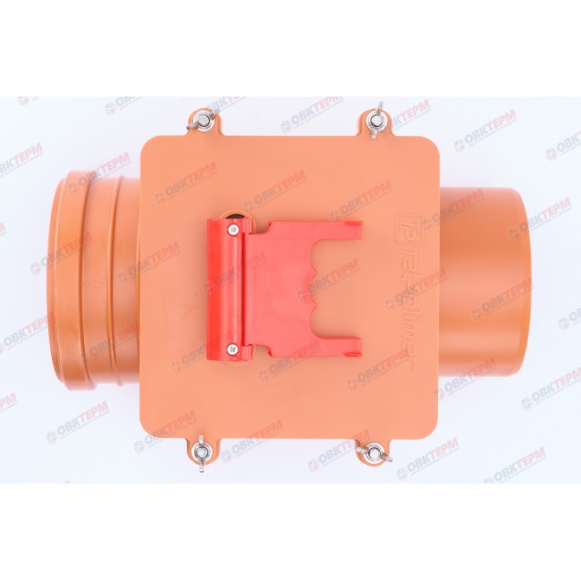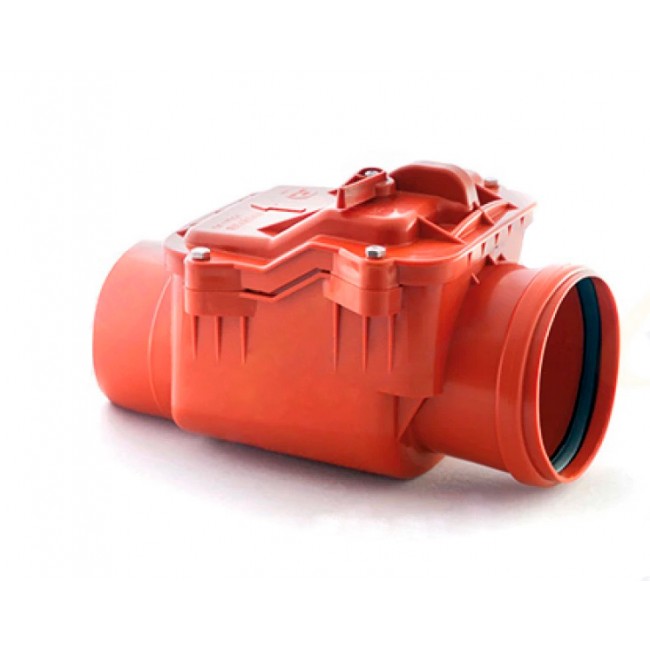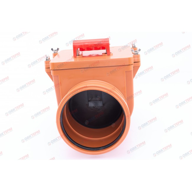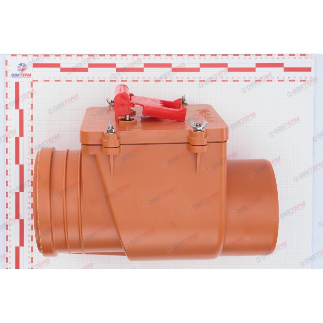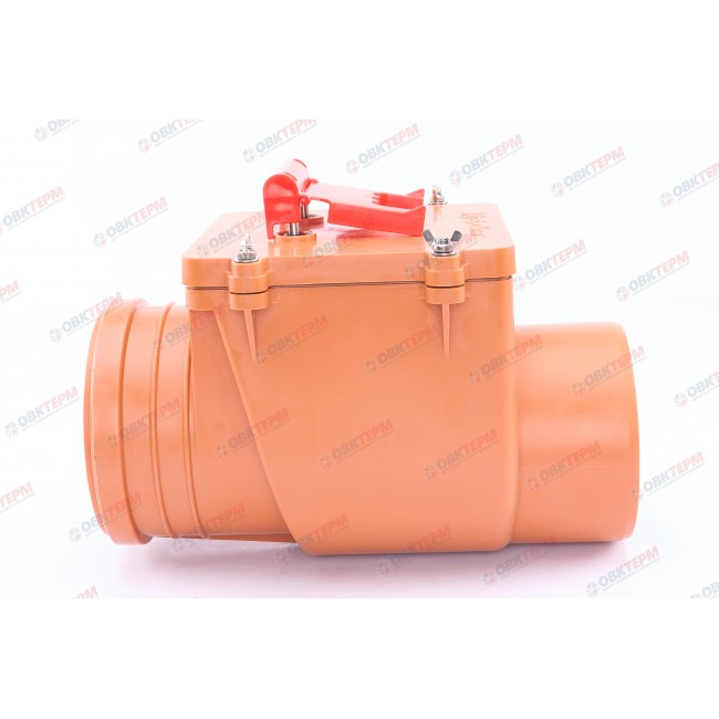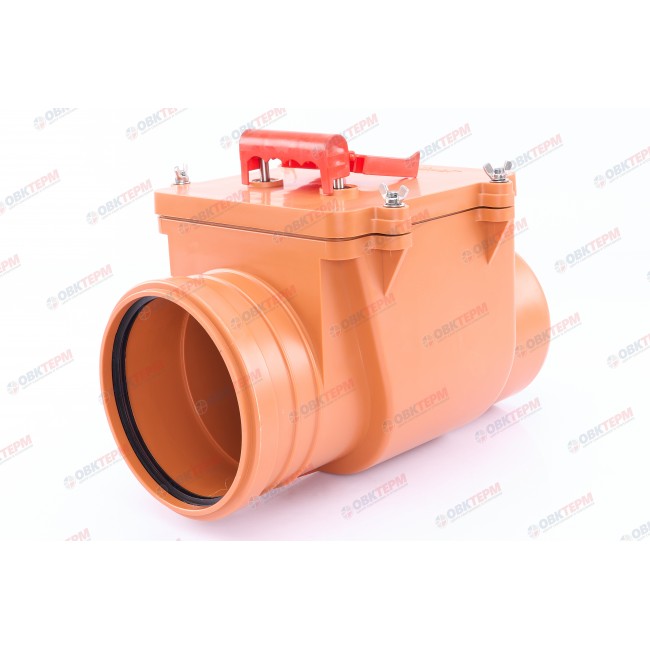 Клапан обратный канализационный с запирающей заслонкой из профилированной нержавеющей стали с язычковым уплотнением, с ревизионной крышкой и присоединительными выходами под раструбные трубы ПП, ПВХ, с возможностью фиксации заслонки в закрытом состоянии при помощи ручного фиксатора с предохранителем от самопроизвольного закрытия.