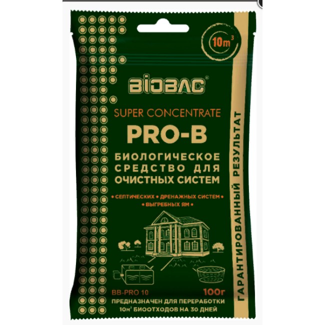 BB-PRO 10 Концентрированное биологическое средство PRO-B - это уникальная композиция аэробных и анаэробных микроорганизмов. Данный препарат предназначен для эффективного функционирования очистных систем таких как септические, дренажные системы, выгребные ямы и дачные туалеты. Профессиональное средство супер концентрат PRO-B предназначен как для регулярного применения, так и для экстренного восстановления функционирования очистных систем. Свойства: Полностью устраняет неприятные запахи. Разлагает фекальные массы, жиры, бумагу, мыло и моющие средства. Рефрактирует фекалии в гелевую массу. Разжижает донный осадок. Предотвращает появление жировой и мыльной пленки на стенках и дне септиков и выгребных ям. Предотвращает образование засоров, мыльной и жировой пленки в дренажных системах и трубах. Сокращает объемы твердых фракций. Восстанавливает эффективное функционирование всех вышеперечисленных систем. Сводит к минимуму необходимость ассенизации. Препятствует развитию личинок насекомых.