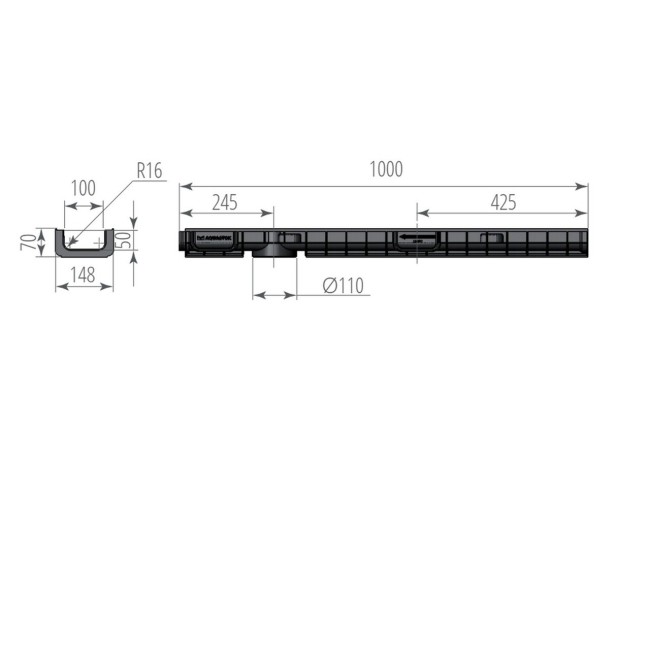 Лоток ЛВП Norma DN100 H55 без решетки 1000 х 148 х 55 Аквасток