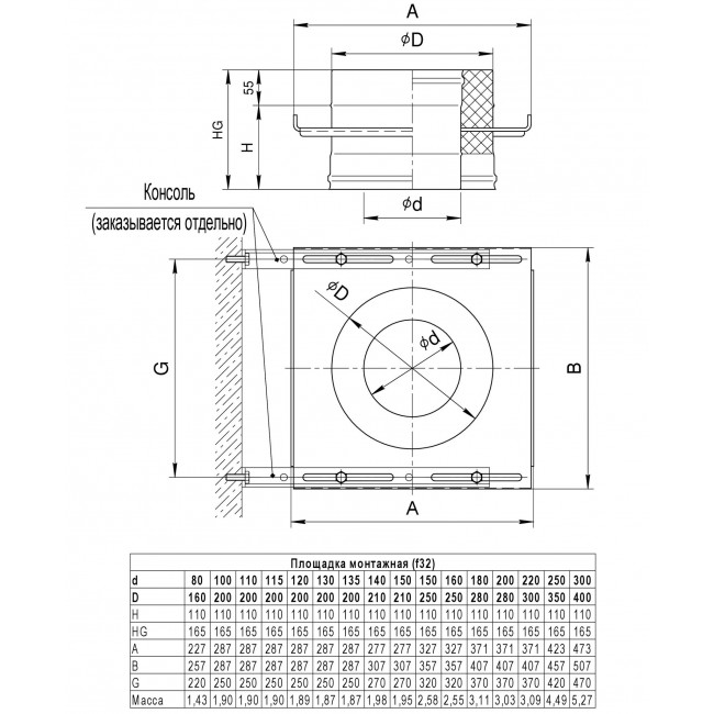 Площадка служит для удержания веса основного неутепленного (одностенного) дымохода и передачи его уже на консоли, опору или подкосы основного крепления, закрепленные на стене. Площадка представляет собой пластину с закрепленной в ней отрезком трубы и имеет ребра жесткости и продольные вырезы в местах закрепления. Крепление отрезка трубы на пластине производится во время формования раструбов путем выдавливания кольцевых бортиков в трубе с двух сторон пластины. Формование бортиков позволяет жестко и надежно закрепить пластину на трубе. С помощью продольных отверстий на пластине можно производить регулировку положения изделия на опорной поверхности в диапазоне 30 мм.