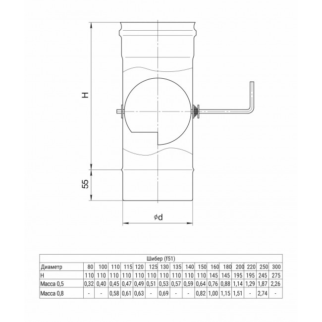 Шибер поворотный предназначен для регулировки тяги внутри дымового канала. Элемент выполняется из стали толщиной 0,5 мм или 0,8 мм.