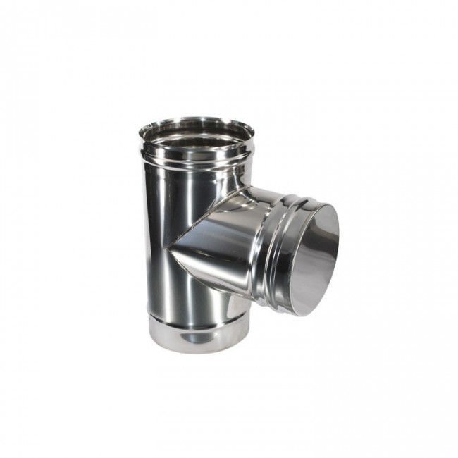 Предназначен для изменения направления дымового канала, используется в местах присоединения теплогенерирующего аппарата к основному каналу. Выполняет функцию очистного приспособления, облегчает обслуживание дымохода. Тройник 90° наиболее простое решение построения дымохода в вашем доме, когда необходимо вывести трубу на улицу.