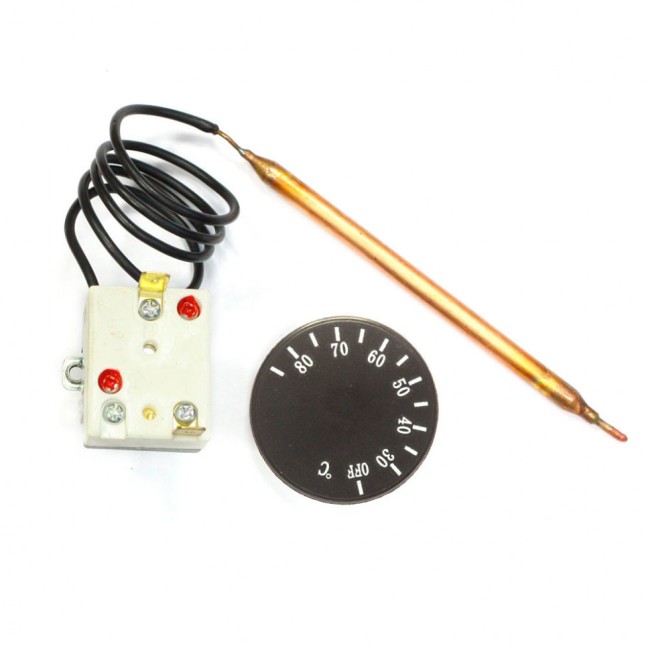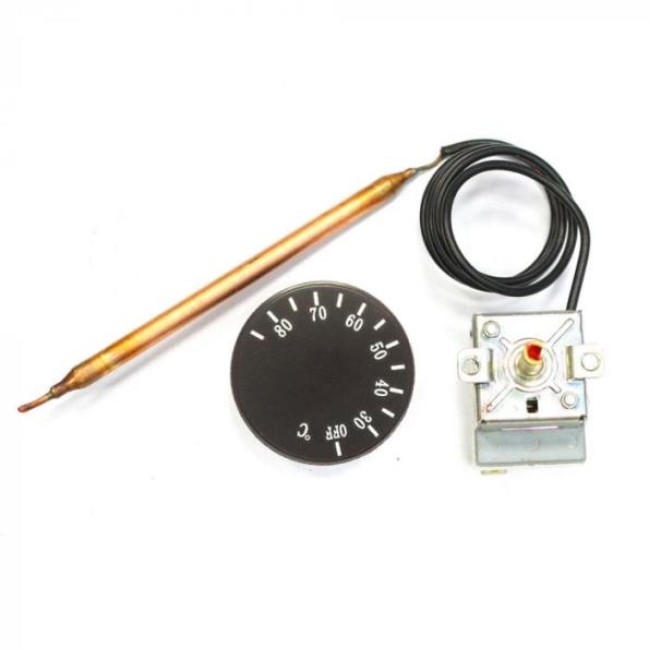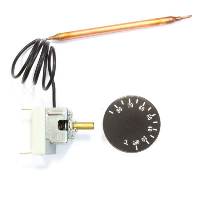 Термостат капиллярный для электрических котлов с ручкой регулировки температуры. Принцип работы капиллярного термостата: при нагревании датчика происходит расширение содержимого капсулы, которое через капиллярную трубку оказывает давление на мембрану реле, а при достижении заданной температуры происходит размыкание контактов. Обычная погрешность такого устройства составляет ±3-4°C. Капиллярный терморегулятор, очень прост, надежен и энергонезависим, благодаря чему используется в разнообразной технике.