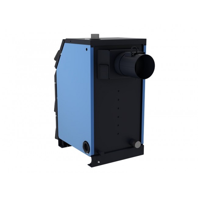 Корпус котла под декоративной обшивкой изолирован бальзатовым картоном. Данная особенность снижает теплопотери водяной рубашки. Два варианта загрузки топлива. Горизонтальная дверца будет удобна для верхней загрузки угля и доступа к теплообменнику во время чистки котла, а шуровочная дверца расположенная горизонтально подойдёт для загрузки дров.Теплообменник состоит из трех контуров. Трубчатый теплообменник в комбинации со съемной заслонкой создают трехходовой теплообменник. Конструкция позволяет более эффективно снимать тепло с выходящих дымовых газов, тем самым увеличивает КПД. На передней панели установлен термоманометр, показывающий температуру подачи воды и давление внутри котла. В качестве источника тепла можно использовать газообразное или пеллетное топливо. Для этого необходимо установить соответствующую горелку. В качестве вспомогательного источника тепла можно использовать электричество. Для этого в котел устанавливается нагреватели из нержавеющей стали (ТЭН);
