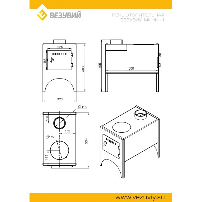 Печь Везувий Буржуйка Мини (дрова/уголь, дымоход Ø115мм)