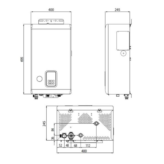 Настенные электрические котлы для отопления. Встроенный расширительный бак, циркуляционный насос, автоматический воздухоотводчик. Ступенчатое включение мощности. Функция «теплый пол». Возможность регулировки температуры ГВС при подключении отдельного внешнего бойлера. Электрические нагреватели - сплав Incoloy800. Рабочие функции: защита от замерзания, регулировка температуры, защита от перегрева. Функции безопасности: защита от короткого замыкания, датчик давления, датчик уровня воды. 3-фазный 380В, 50Гц, 4-жильный кабель