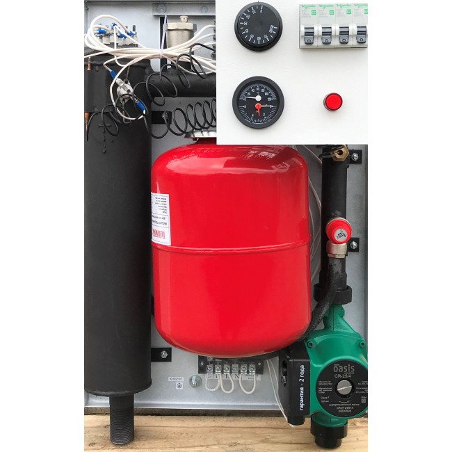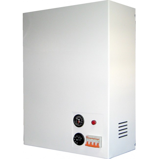 Электрический котел предназначены для водяного отопления помещений, имеющих открытую и закрытую отопительную систему, работающую при давлении не более 0,3 МПа при напряжении трехфазной сети 380В. В комплект котла входит: корпус, стальная емкость с нагревательными элементами, аппаратура управления, расширительный бак объемом 8 литров, циркуляционный насос, автоматический воздухоотводчик, предохранительный клапан, термоманометр, реле защиты от сухого хода, регулируемый термостат, аварийный термостат, дренажная трубка, крепеж. На лицевой стороне расположена ручка регулятора температуры, индикатор включения и четыре автоматических выключателя.