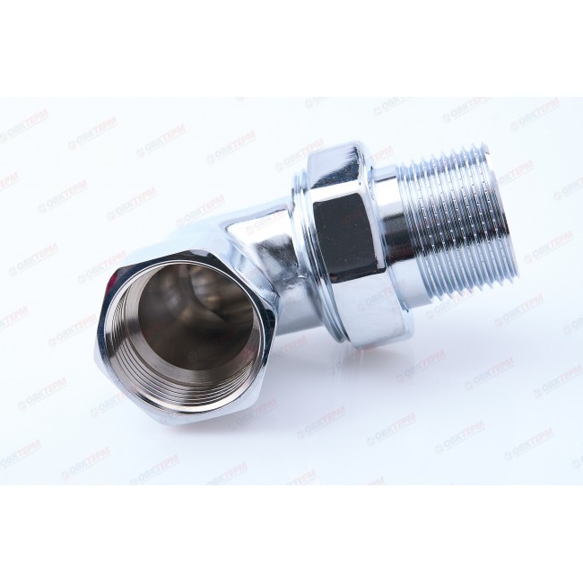 Американка угловая 3/4,хром. Материал - высокопрочная горячеприссованная латунь CW617N стандарта EN12165; Резьба - трубная (дюймовая) цилиндрическая по ГОСТ 6357 (класс точности "В") соответствует стандарту ISO 228-1. Специальная насечка на наружной резьбе для эфективного удержания уплотнительного материала. Технология и качественное сырье придают изделиям достаточную прочность при небольшом весе. Макс. рабочее давление - 40 бар (до 1"); 25 бар (свыше 1"). Макс. рабочая температура - 120*С.
