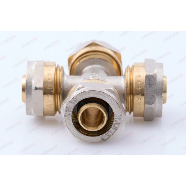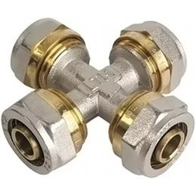 Количество в упаковке: 5шт. Компрессионные фитинги для труб из металлопластика. Одно из преимуществ этих фитингов – использование для монтажа простого набора инструментов: трубореза, калибратора и набора рожковых ключей. Эти фитинги позволяют получить надёжные соединения, которые, при необходимости изменения системы, можно разбирать и собирать. К недостаткам системы с такими фитингами можно отнести необходимость обеспечения доступа к фитингам для контроля и возможного обслуживания. Крестовина является одним из разновидностей обжимного фитинга и используется для применения совместно с металлопластиковыми трубами.