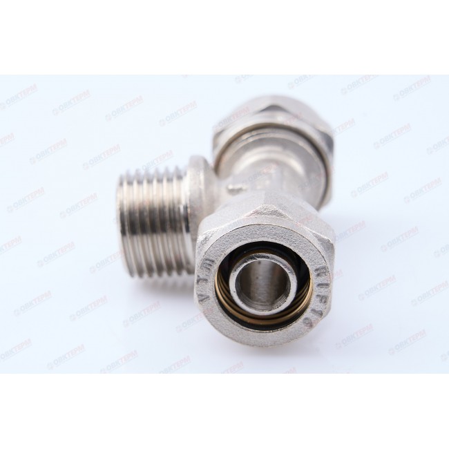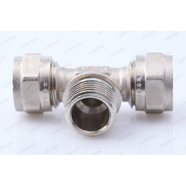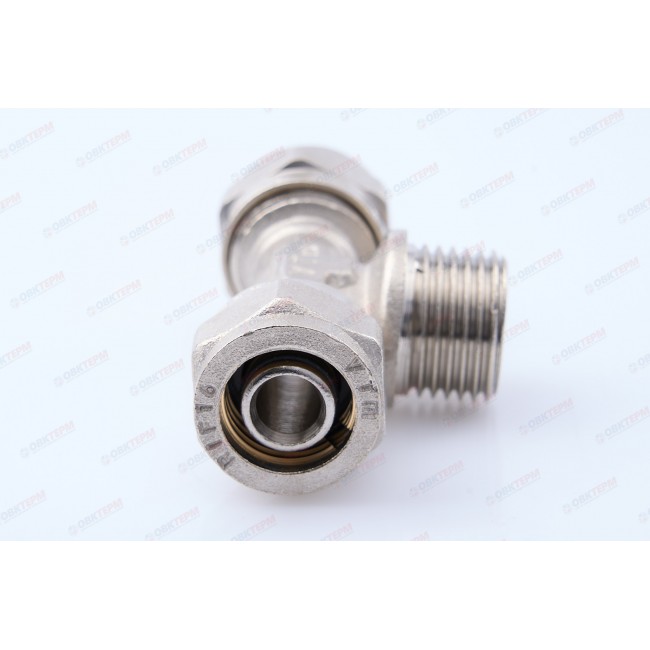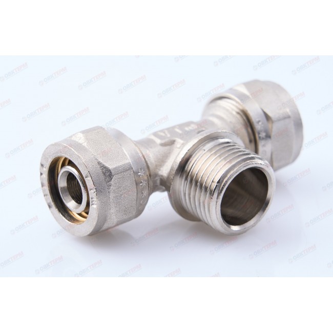 Фитинг обжимной – тройник с переходом на наружную резьбу для присоединения металлополимерных (металлопластиковых) трубопроводов. Резьба фитинга – наружная трубная по ГОСТу 6357.