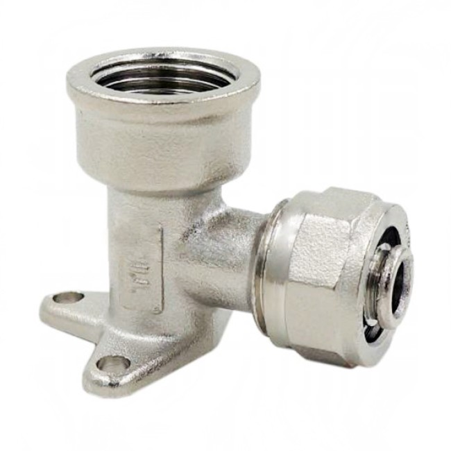 Количество в коробке: 80шт. Количество в упаковке: 5шт. Обжимной фитинг – угольник с креплением и переходом на внутреннюю резьбу для металлопластиковых (металлополимерных) трубопроводов. Резьба фитинга – внутренняя трубная по ГОСТу 6357.