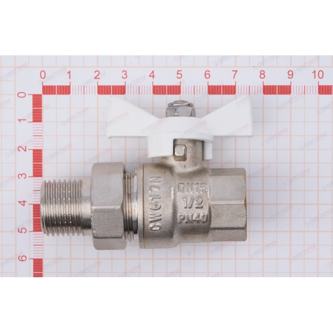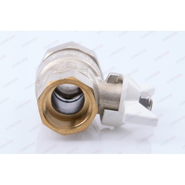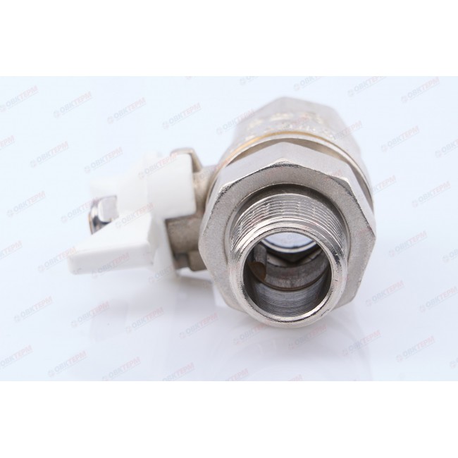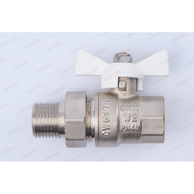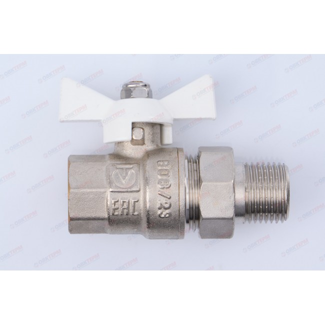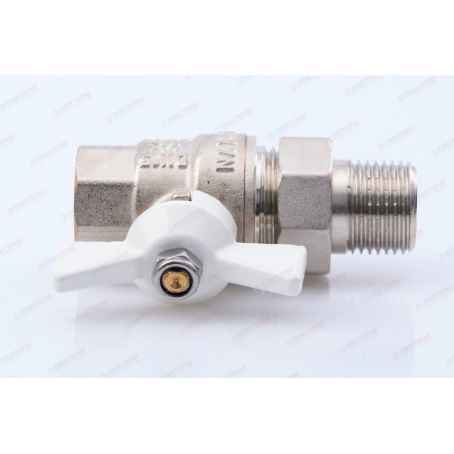 Прямой полнопроходной ремонтопригодный шаровой кран с увеличенным ресурсом. Соединен накидной гайкой с резьбовым полусгоном. Корпуса деталей – латунные, никелированные. Кран оснащен ручкой типа «бабочка» с утолщенной стенкой из алюминиевого сплава и эпоксидной покраской белого цвета. Резьба присоединений – внутренняя/наружная.